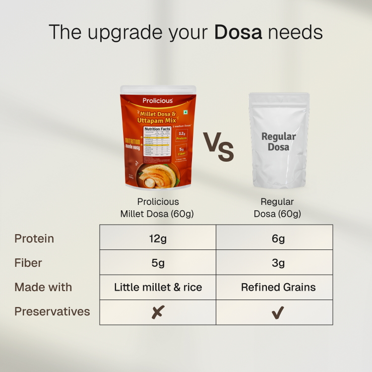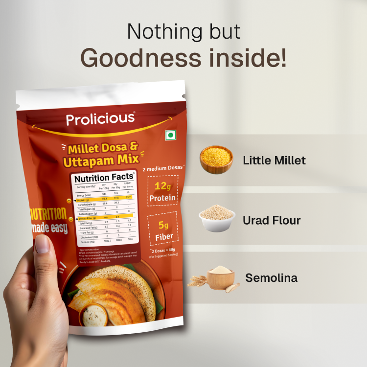 Enjoy the authentic taste of crispy dosas and soft uthappams — now with a nourishing protein boost. Wholesome, delicious, and incredibly convenient — Prolicious Millet Dosa Mix packs 12g of plant protein and 5g of fiber per serving, with no preservatives. No soaking, no fermenting, no fuss — just mix, cook, and enjoy crispy dosas and uthappam.