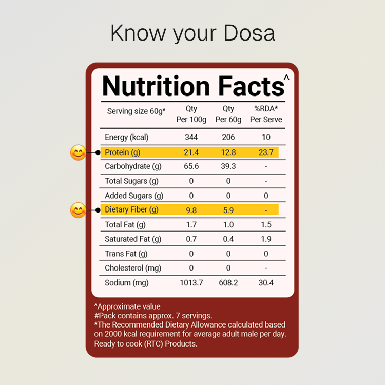 ANS: The Indian vegetarian diet lacks protein. Our Rava Idli has been rebalanced to give you over 10g Natural Protein in just 60g (2 Dosas). Protein supports muscle repair and keeps you fuller for longer, while fiber improves digestion and aids in weight management. - I’m trying to lose weight, can I have this Dosa?