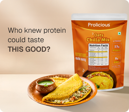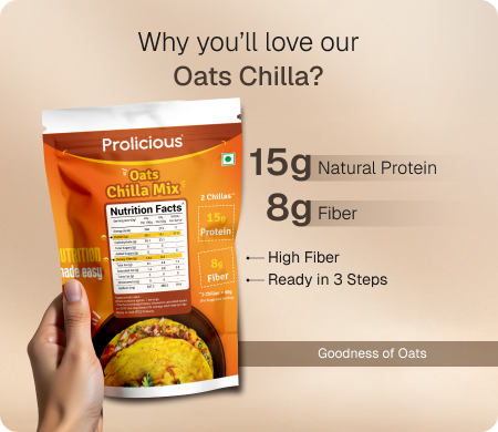 Make breakfast lip-smacking, nutritious, & convenient with our Oats Chilla Mix. Packed with 15g of natural protein and 8g of fiber in just two chillas, Prolicious Oats Chilla Mix is your perfect high-protein breakfast fix. Made with real, wholesome ingredients, it’s a deliciously satisfying way to start your mornings — nourishing, convenient, and loved by the whole family.