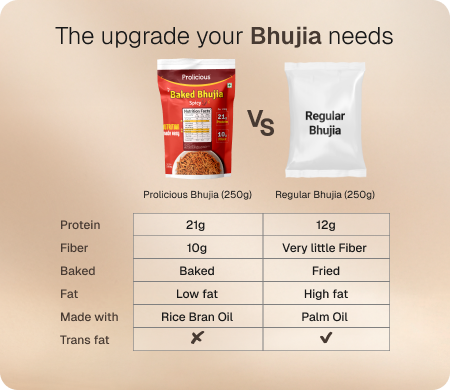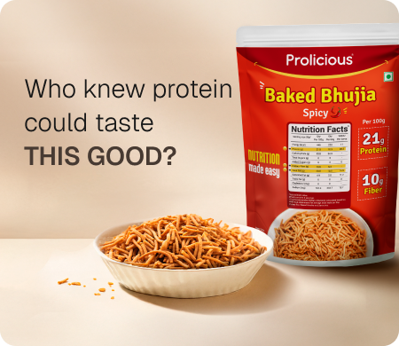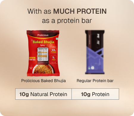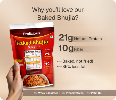 ANS: The Indian vegetarian diet lacks protein. Our Baked Bhujia has been rebalanced to give you over 10g Natural Protein in just 50g. Protein supports muscle repair and keeps you fuller for longer, while fiber improves digestion and aids in weight management. - Is Prolicious Baked Bhujia Diet Friendly?