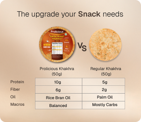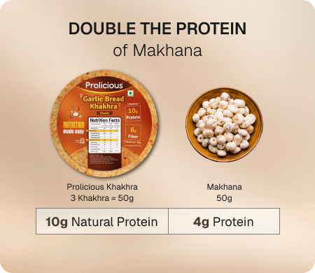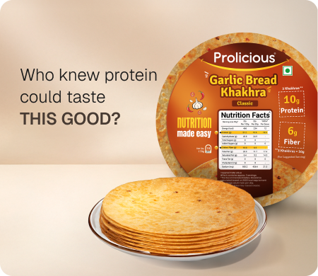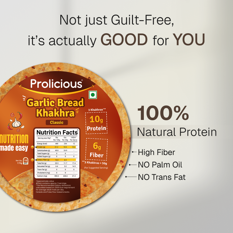 ANS: The Indian vegetarian diet lacks protein. Our Garlic Bread Khakhra has been rebalanced to give you over 10g Natural Protein in just 50g (3 Khakhras). Protein supports muscle repair and keeps you fuller for longer, while fiber improves digestion and aids in weight management. - Is Prolicious Khakhra diet-friendly?