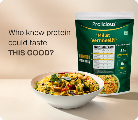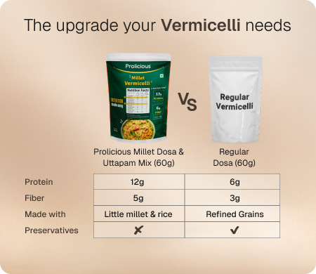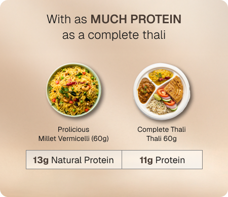 All the Nourishment of a Thali—In One Bowl of Vermicelli Prolicious Millet Vermicelli is a delicious, nutrient-rich upgrade to regular vermicelli. Made with little millet and peanut flour, it delivers 13g protein, 6g fiber, and essential minerals like iron, magnesium, and phosphorus — making it a wholesome, balanced meal in every bowl.