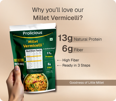 ANS: The Indian vegetarian diet lacks protein. Our Millet Vermicelli has been rebalanced to give you over 10g Natural Protein in just 60g (1 Serve). Protein supports muscle repair and keeps you fuller for longer, while fiber improves digestion and aids in weight management. - Which millet have you added to this Vermicelli?