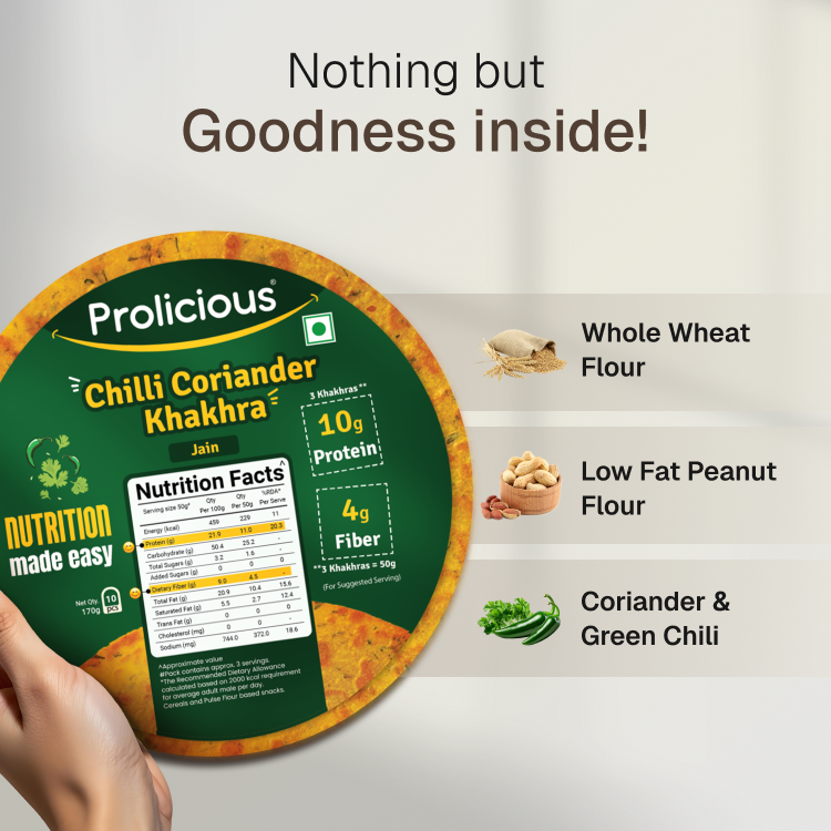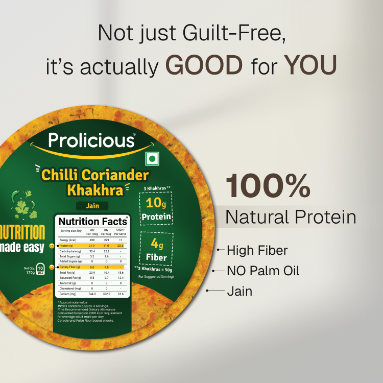 ANS: The Indian vegetarian diet lacks protein. Our Khakhras have been rebalanced to give you over 10g Natural Protein in just 50g (3 Khakhras). Protein supports muscle repair and keeps you fuller for longer, while fiber improves digestion and aids in weight management. - Is Prolicious Khakhra Diet Friendly?