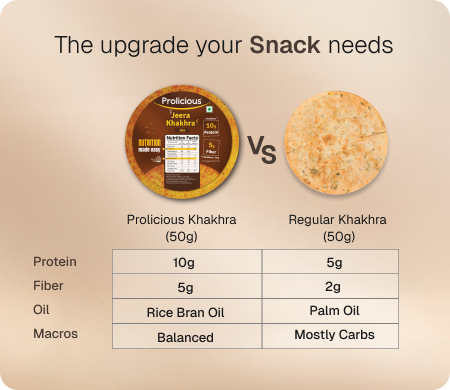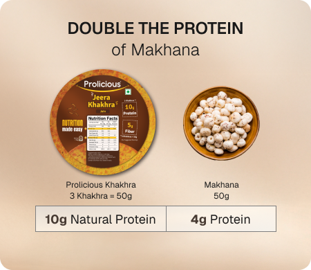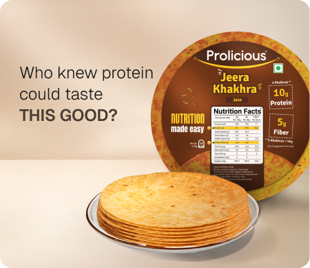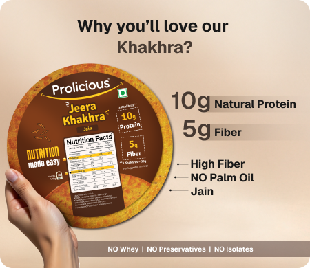 ANS: The Indian vegetarian diet lacks protein. Our Jeera Khakhra has been rebalanced to give you over 10g Natural Protein in just 50g (3 Khakhras). Protein supports muscle repair and keeps you fuller for longer, while fiber improves digestion and aids in weight management. - Is Prolicious Khakhra diet-friendly?
