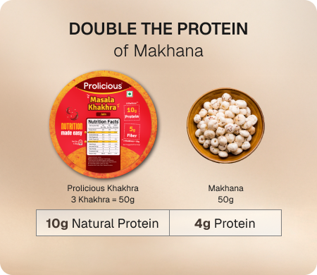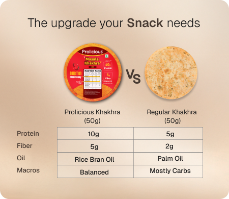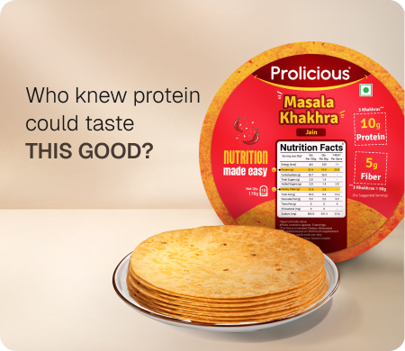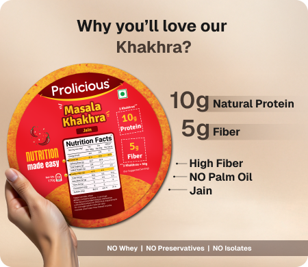ANS: The Indian vegetarian diet lacks protein. Our Masala Khakhra has been rebalanced to give you over 10g Natural Protein in just 50g (3 Khakhras). Protein supports muscle repair and keeps you fuller for longer, while fiber improves digestion and aids in weight management. - Is Prolicious Khakhra diet-friendly?
