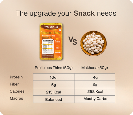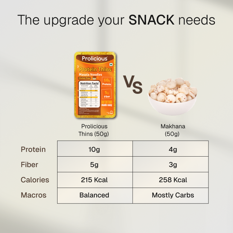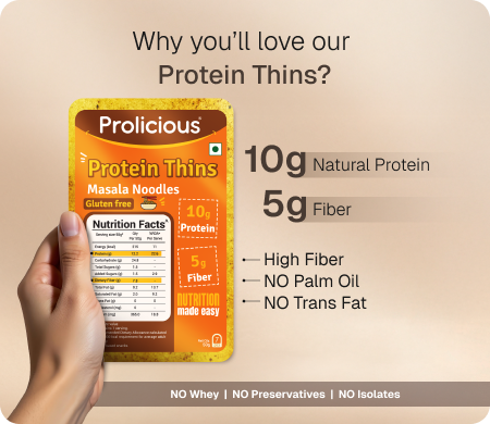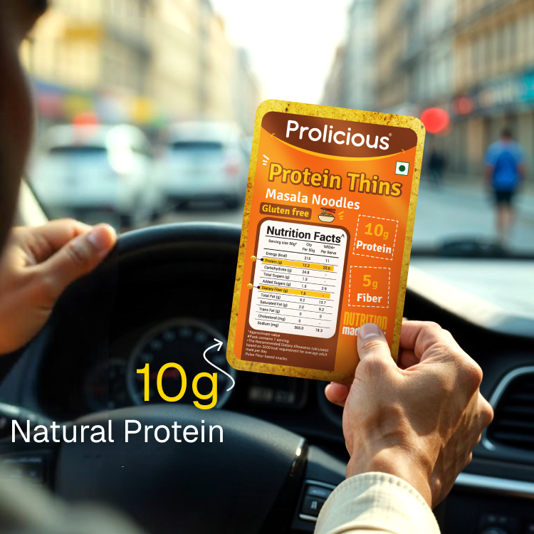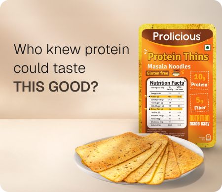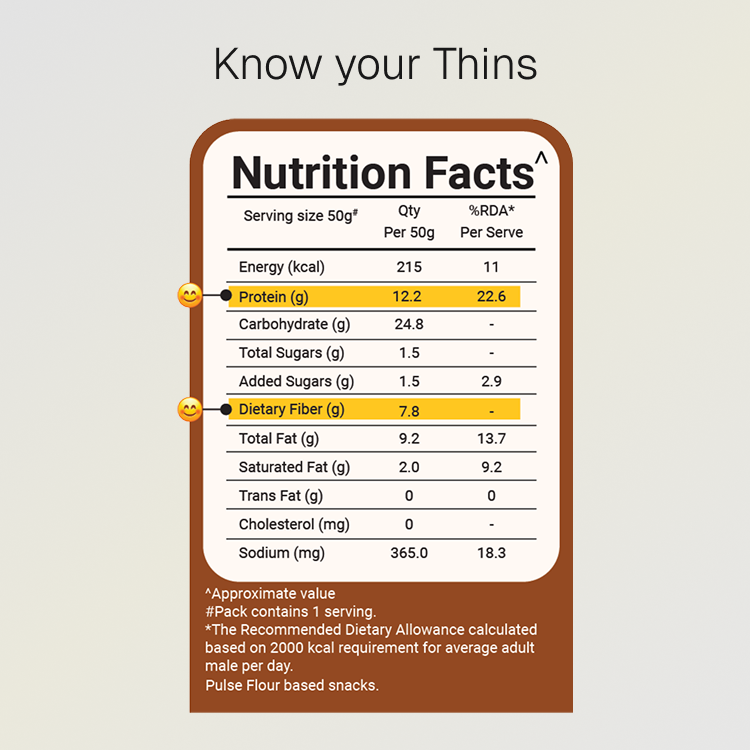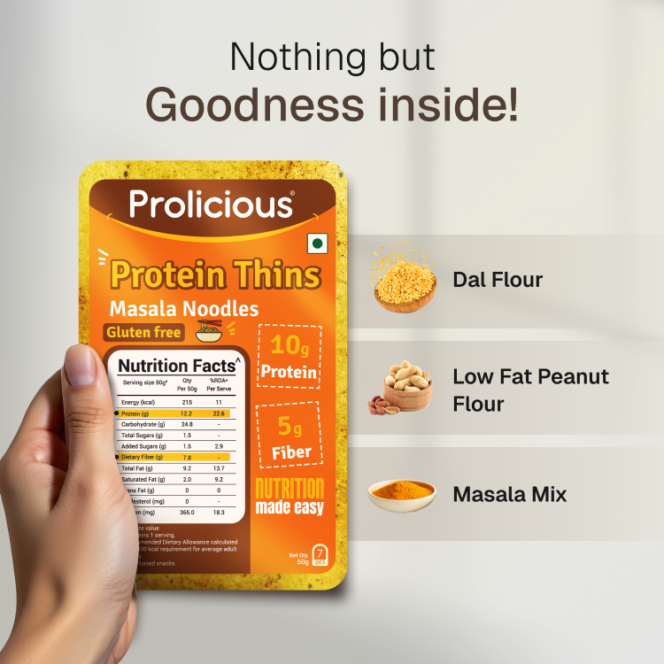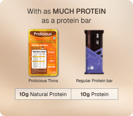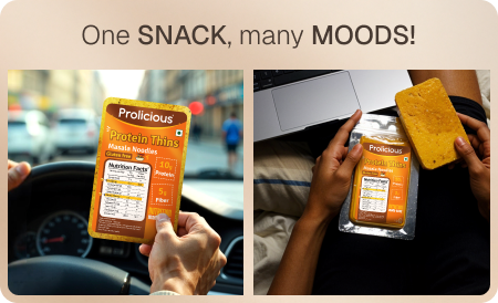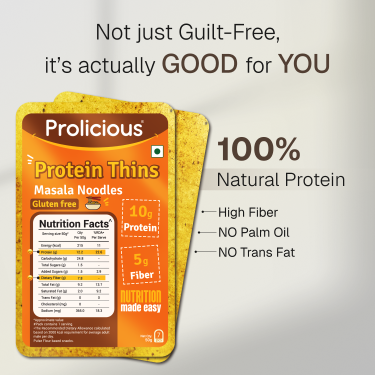 Crunch into our Masala Noodle Protein Thins - where the nostalgic taste of classic masala noodles meets the goodness of protein and fiber. With 10g of natural protein and 4g of fiber per serving, they’re a smarter, feel-good alternative to chips , biscuits and even Makhanas. Roasted in rice bran oil, they are full of comforting flavor, free from palm oil and preservatives.