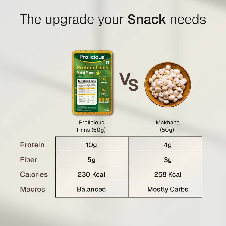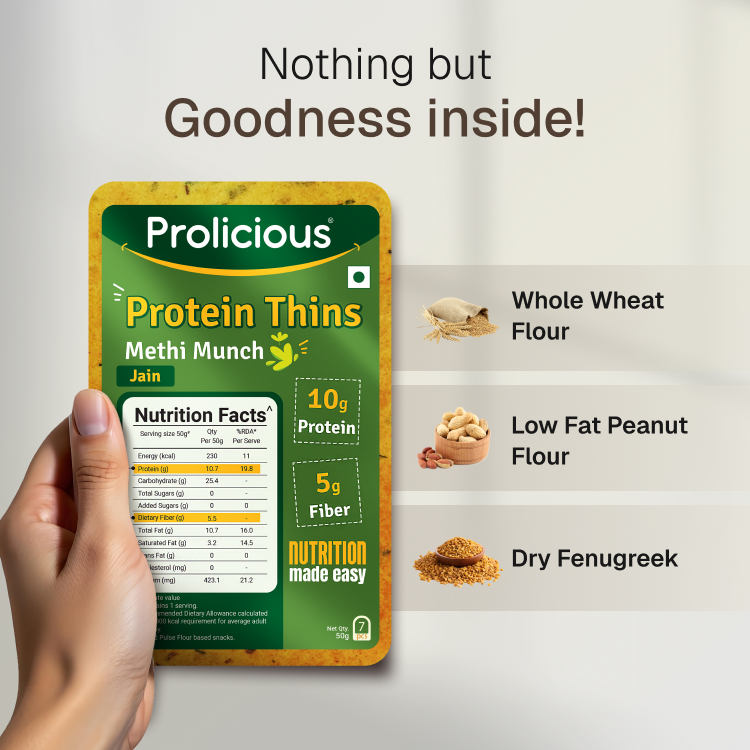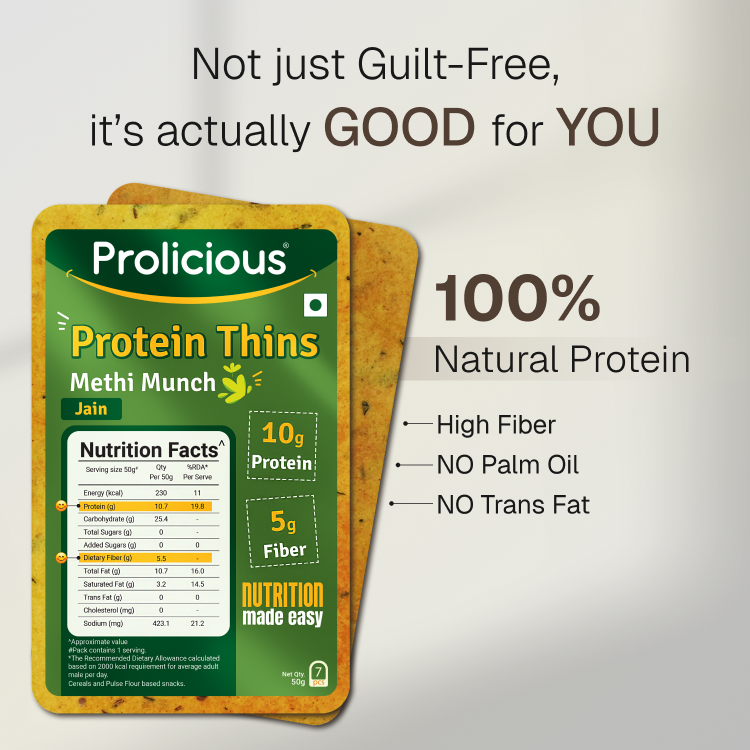 Add a wholesome twist to your tea-time with Prolicious Methi Munch Thins — a classic flavor you love, now made better. Packed with more protein, more fiber, and made from clean, kitchen ingredients, it's a smart swap for chips and biscuits.