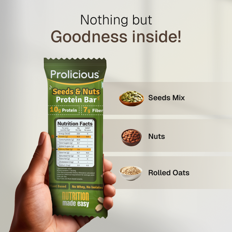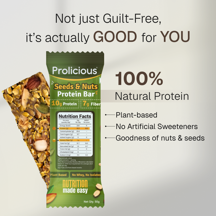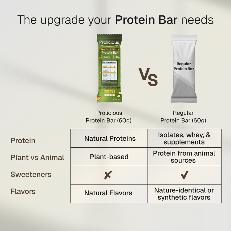 Made without isolates, whey, or supplements, Prolicious Seeds & Nuts Protein Bar delivers natural, plant-based protein the way nature intended - simple, satisfying, and delicious. Whether you're fueling a workout or just need a wholesome snack, this is the bar your body will thank you for.