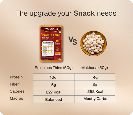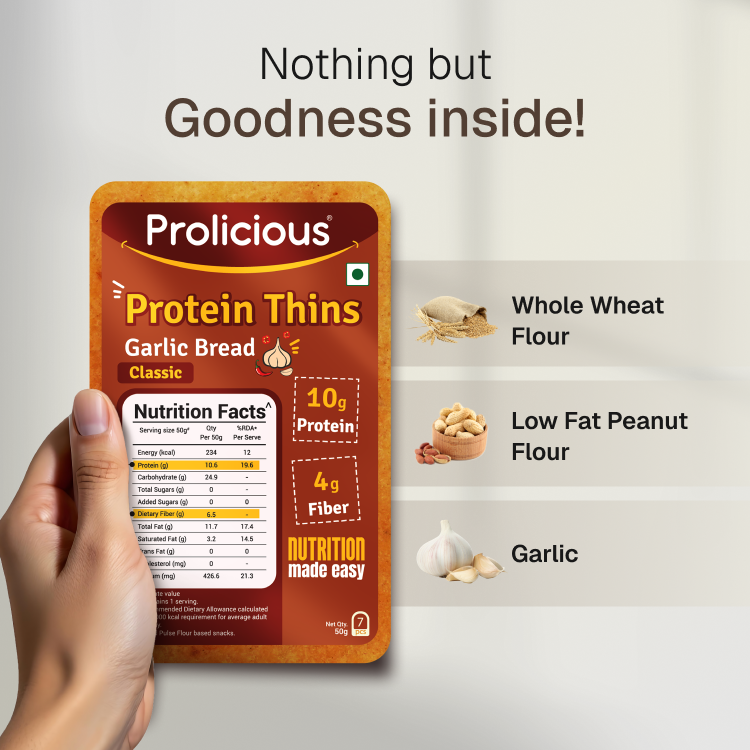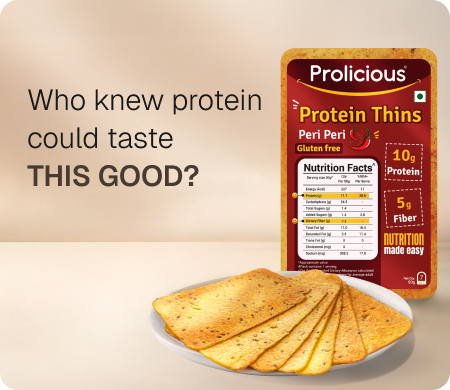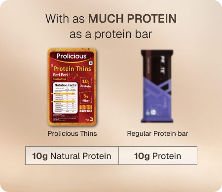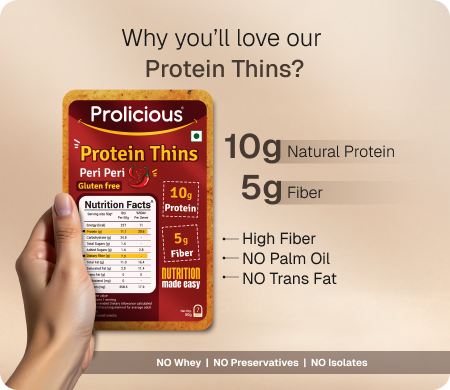 ANS: The Indian vegetarian diet lacks protein. Our Thins have been rebalanced to give you over 10g Natural Protein in just 50g (1 Pack). Protein supports muscle repair and keeps you fuller for longer, while fiber improves digestion and aids in weight management. - Is Prolicious Thins Diet Friendly?