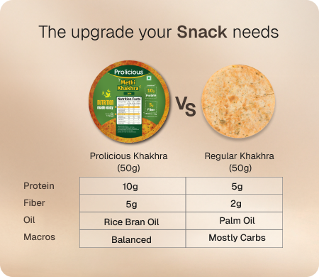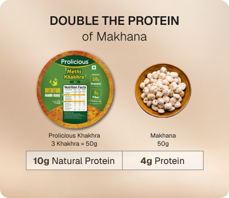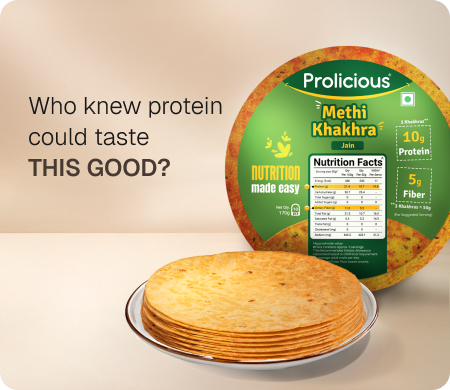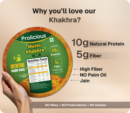 ANS: The Indian vegetarian diet lacks protein. Our Khakhras have been rebalanced to give you over 10g Natural Protein in just 50g (3 Khakhras). Protein supports muscle repair and keeps you fuller for longer, while fiber improves digestion and aids in weight management. - Is Prolicious Khakhra Diet Friendly?